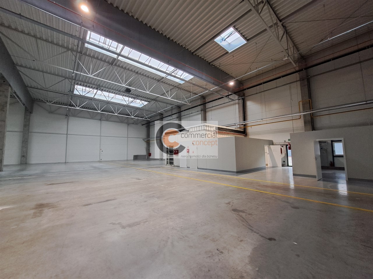 - Wysokość hali: 7,5m co pozwala na składowanie wysokiego asortymentu lub instalację regałów magazynowych.