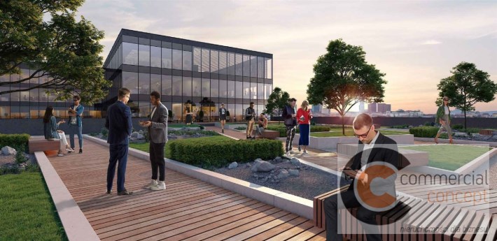 Biurowiec będzie wyróżniał się dziedzińcem o powierzchni 1050m2 na którym zaprojektowano alejki spacerowe i strefy relaksu oraz fontannę.